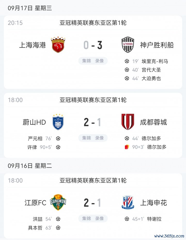 首轮比赛,蓉城、海港、申花出战亚冠精英联赛全败。