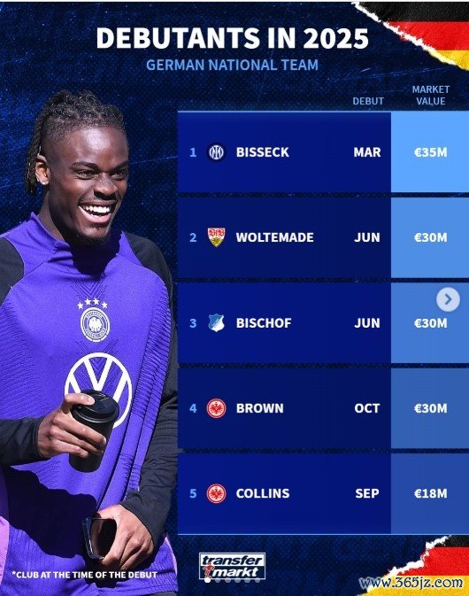 以下为2025年为德国队献技首秀球员身价情况(首秀时辰为其时地点俱乐部):