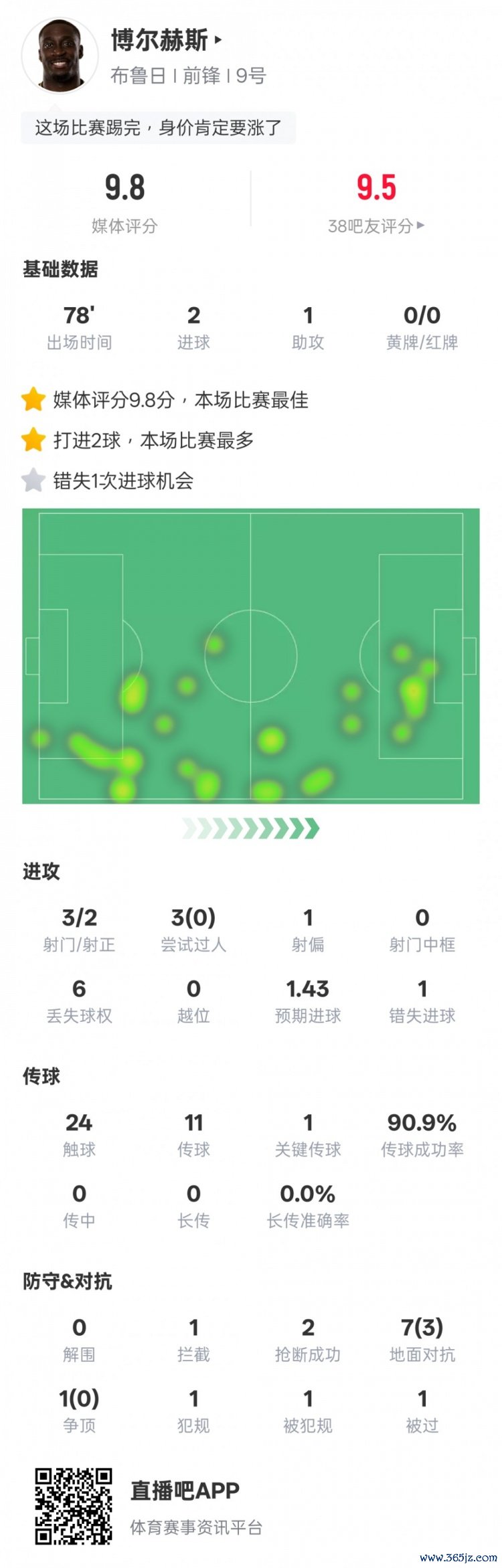 本场比赛,博尔赫斯首发出战,打进2粒进球,送出1次助攻,1次要津传球,传球告捷率90.9%,还有1次阻拦和2次抢断。