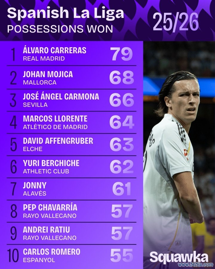 11月12日讯 在球场上,皇马后卫阿尔瓦罗-卡雷拉斯以气魄果断,拼劲奢华著称。凭证Squawka的数据统计,卡雷拉斯是本赛季西甲夺回球权最多的球员,达到了79次。