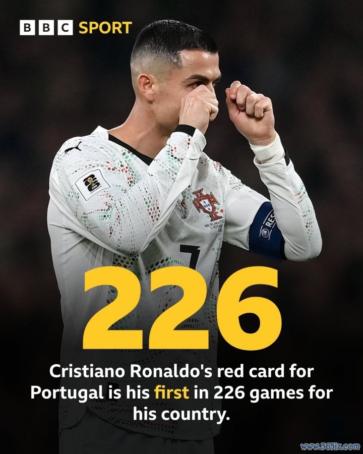 证明统计,这是C罗226场国度队出场初度被罚下。若是盘算统共劳动生计,这是C罗第13次染红,此前12次齐是发生在俱乐部赛事。