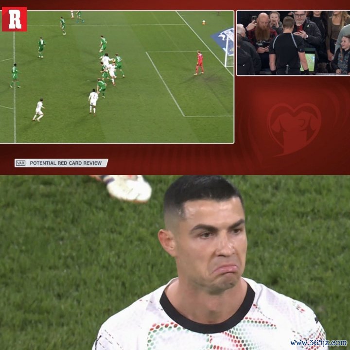 11月14日讯 葡萄牙vs爱尔兰,C罗下半场因肘击看成被罚下。