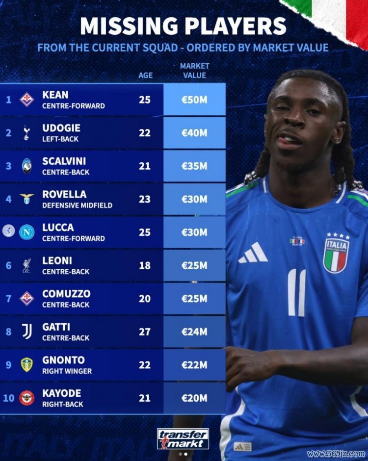 11月18日讯 德转统计了缺席本期意大利队球员的身价比肩出榜单,佛罗伦萨先锋小基恩5000万欧居首,热刺左后卫乌多吉4000万欧第二。