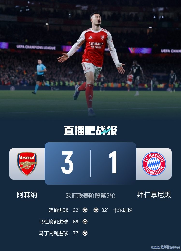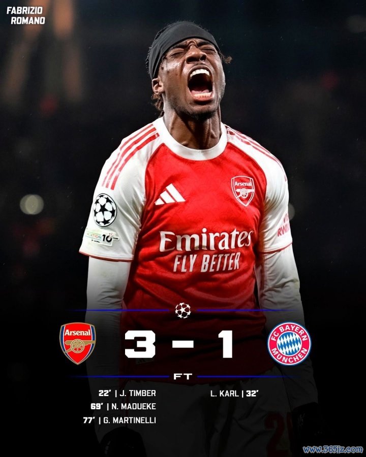 欧冠联赛阶段第5轮,阿森纳3-1降服拜仁慕尼黑,马杜埃凯首球,诺伊尔立正。