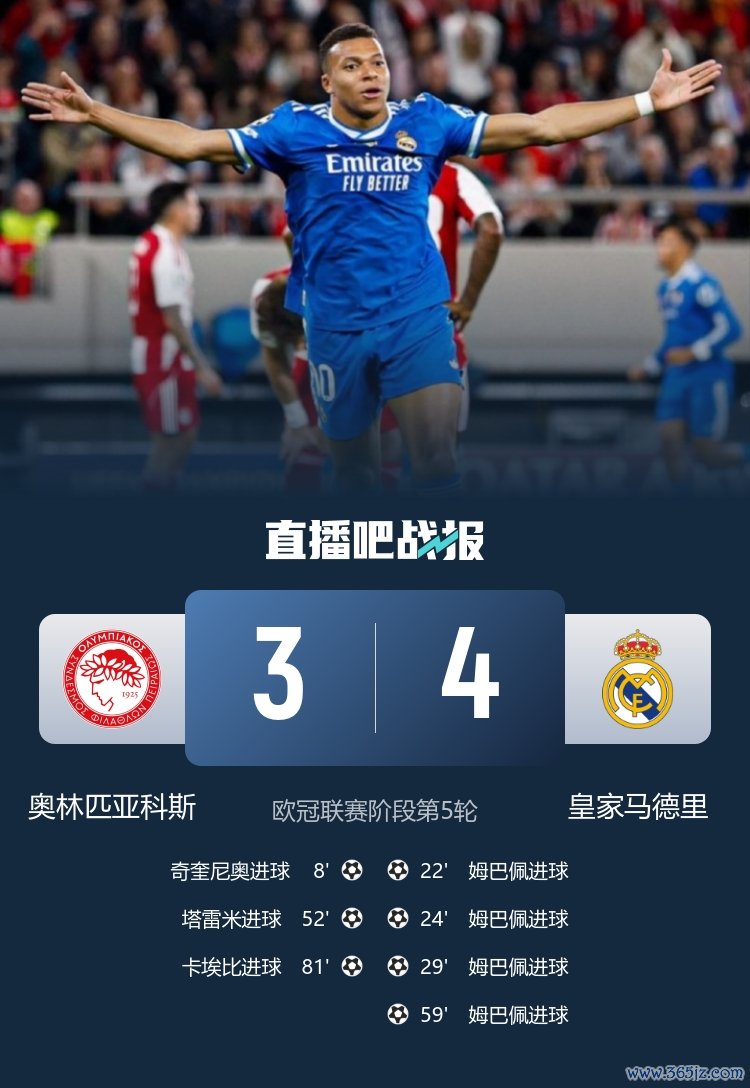 欧冠联赛阶段第5轮,皇马4-3降服奥林匹亚科斯,姆巴佩大四喜。