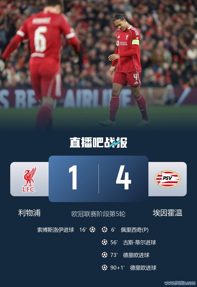 欧冠联赛阶段第5轮,利物浦主场1-4埃因霍温,范戴克送点,科纳特无理。