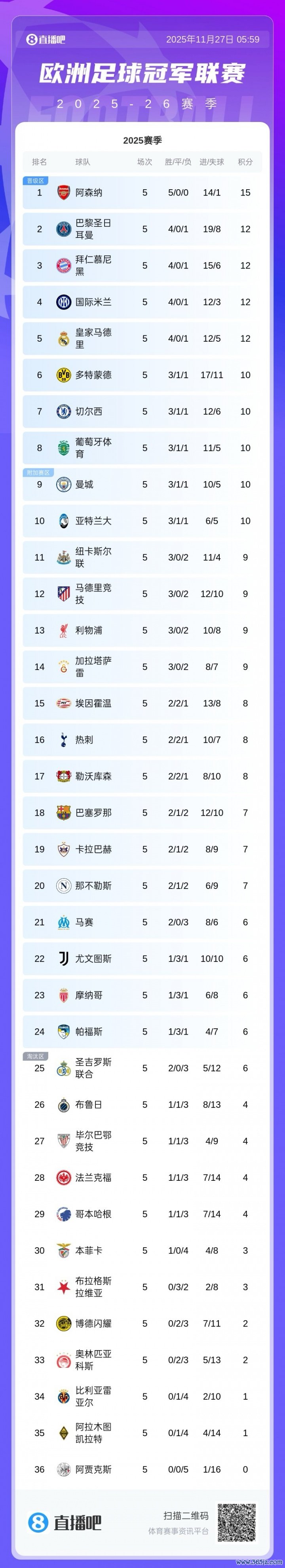 欧冠积分榜:阿森纳全胜3分领跑,巴黎拜仁国米皇马同分分列2-5名
