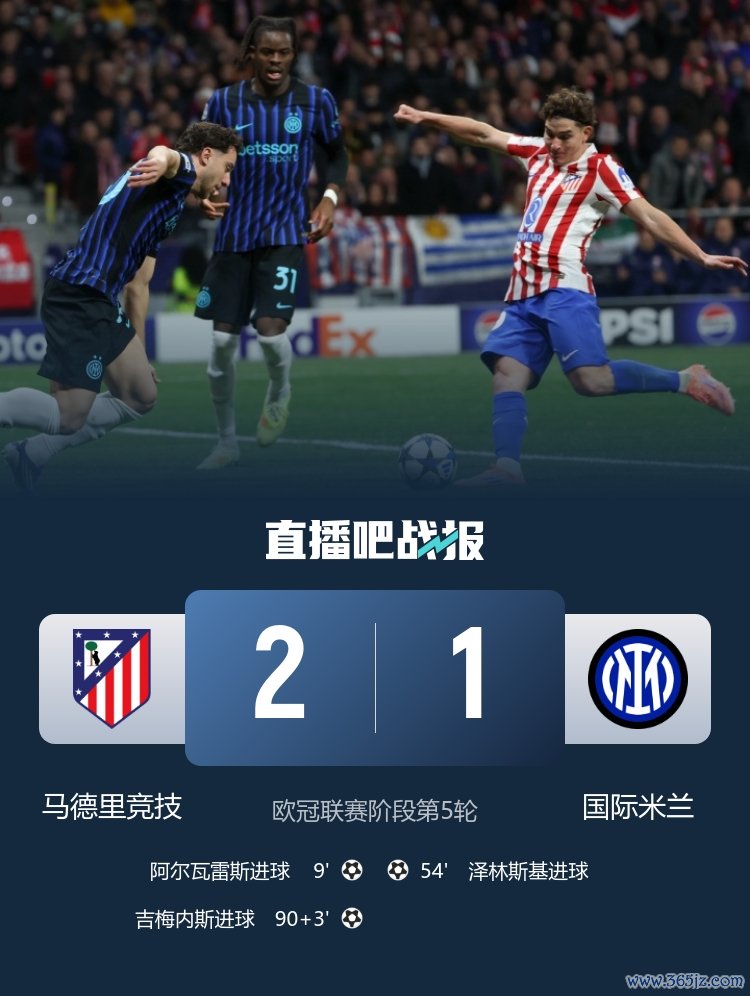 欧冠联赛阶段第5轮,国米1-2遭马竞绝杀,阿尔瓦雷斯、吉梅内斯进球。