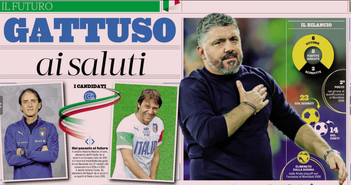 意大利又一次要在失败后寻找新任国家队主帅了,目前加图索已经返回马贝拉陪伴家人,他的执教之旅也即将结束,虽然合同6月份才到期,但随着格拉维纳越来越可能辞职,加图索也不太可能继续留在板凳席上了。他和布冯曾有一个约定:一起留到6月份,但如果加图索没有了格拉维纳的支持,他也可能更早离开,这也不是他第一次勇敢地主动决定自己的未来了。