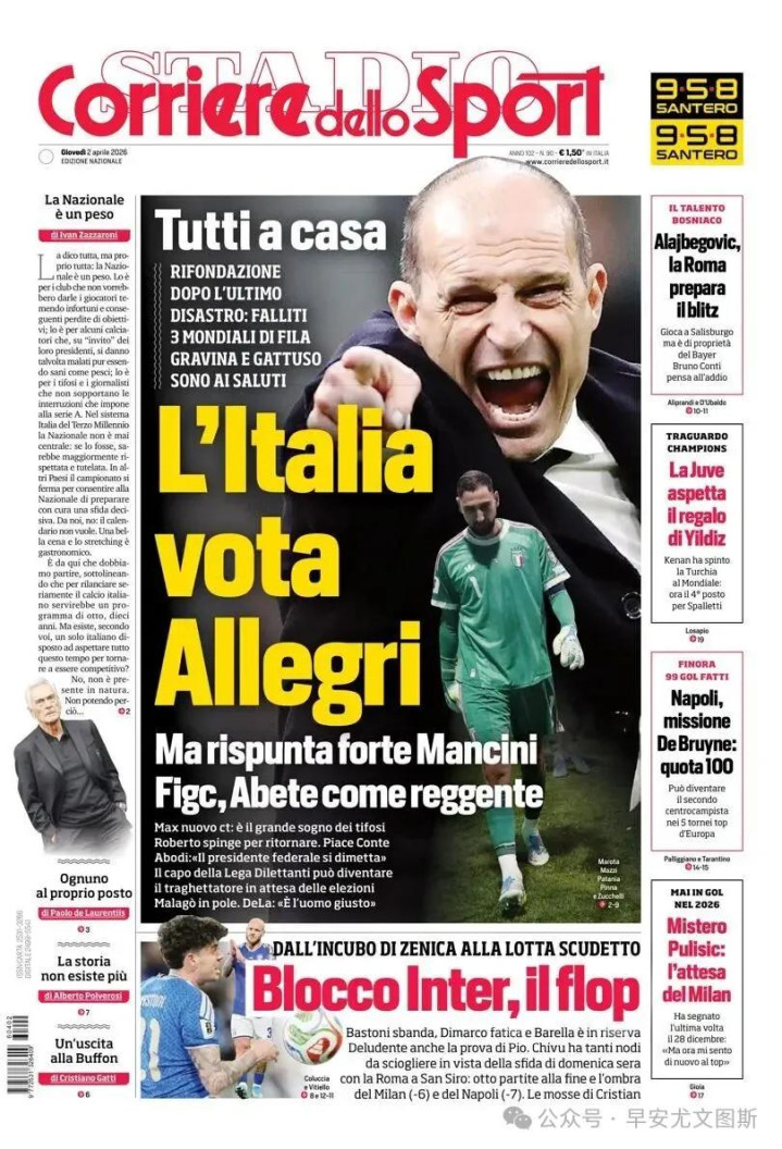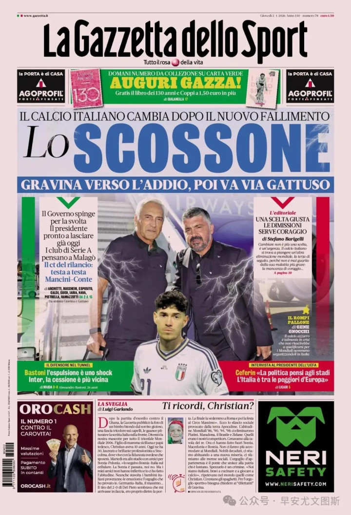 1、“他不能留下来。”所有人都反对格拉维纳:预计今天会被解雇。关于“业余”对手的失态对意大利足协主席产生了反作用,体育第一名 和球迷们都怒不可遏。阿博迪部长猛烈抨击:“需要作出改变”。意大利足协紧急会议,关于阿贝特、马拉戈和马拉尼的继任传闻四起。加图索也即将告别:孔蒂的潜在回归引起了人们的兴趣。帕莱斯特拉和U21上了一课。
