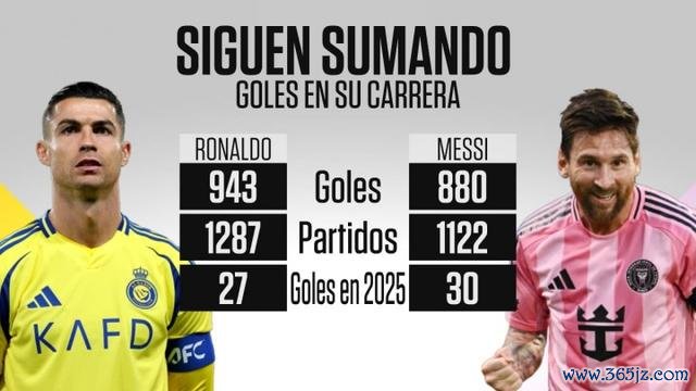 ESPN统计梅罗生计数据,梅西1122场打进880球,2025年打进30球;C罗1287场打进943球,2025年打进27球。