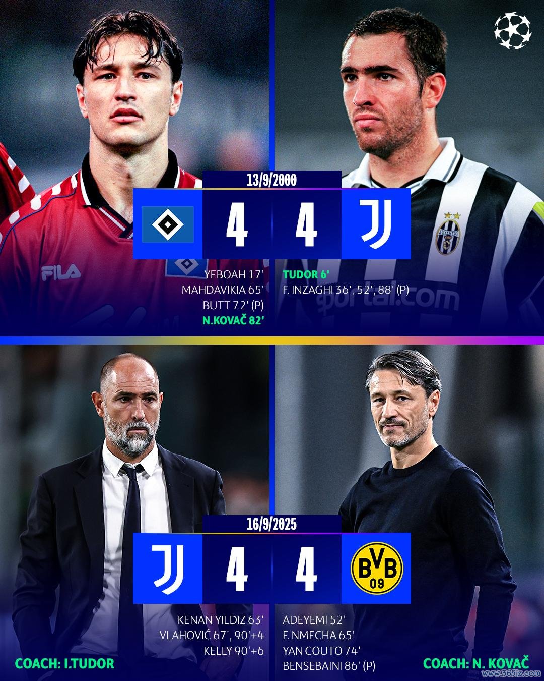 那时图多尔着力的球队相似是尤文图斯,而科瓦奇则着力于汉堡。那时尤文与汉堡在欧冠第一轮小组赛相遇,两队首回合交手中,比分相似为4-4。值得一提的是,二东谈主还辞别获得了进球。