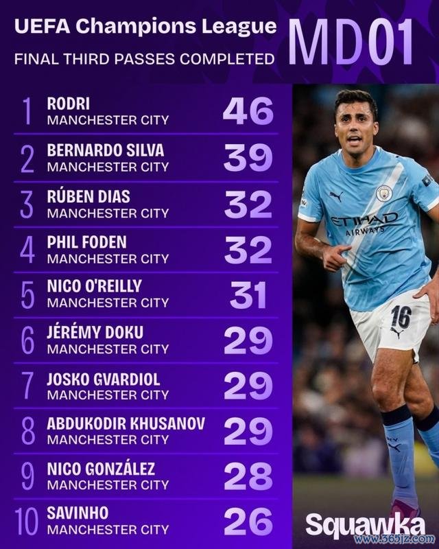 直播吧9月19日讯 知名数据网站Squawka统计了欧冠首轮强大三区传球数据,罗德里46次居首,曼城球员包揽前十。