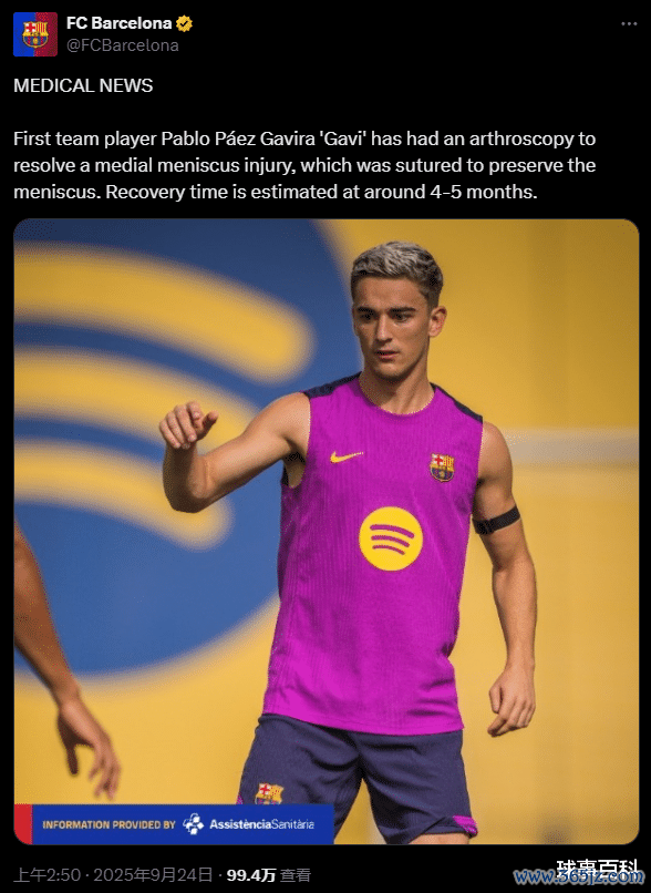 伤病情况出现之后,巴萨蓝本但愿他能幸免手术。但最新音尘显现,加维接受了手术调养,并瞻望要到2026岁首才能复出。巴萨在推特上写说念:“一队球员加维已接受枢纽镜手术,以科罚内侧半月板扯破问题,手术接受缝合表情保留半月板。瞻望康复技艺为4至5个月。”