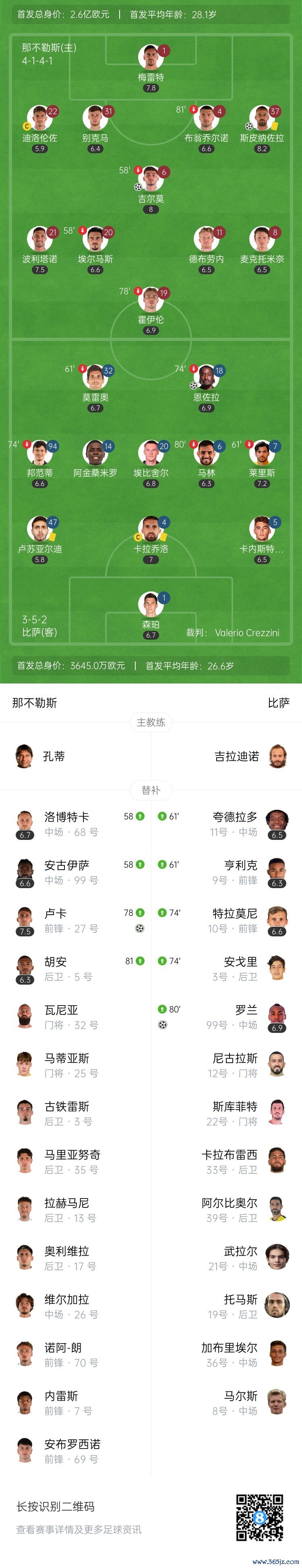 下半场补时6分钟。最终全场比赛截至,那不勒斯3-2比萨。