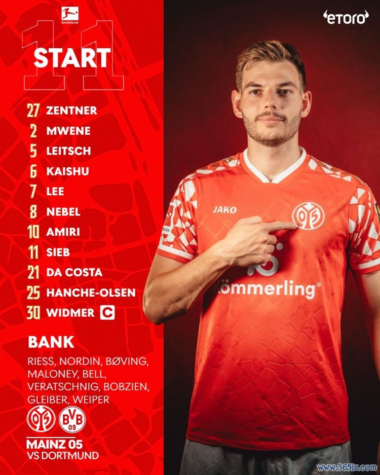 27-岑特纳、2-姆维尼、5-莱特施、6-佐野海舟、7-李在城、8-内布尔、10-阿米里、11-西耶布、21-达科斯塔、25-奥尔森、30-威德默