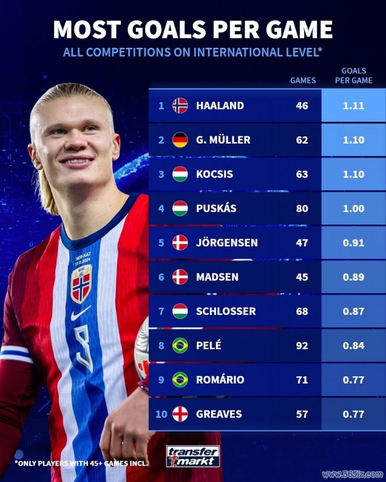 10月13日讯 德国转会市集统计了足坛历史球员在国度队的场均进球数目,并排出榜单,哈兰德1.11球居首,盖德-穆勒、柯奇士次席。