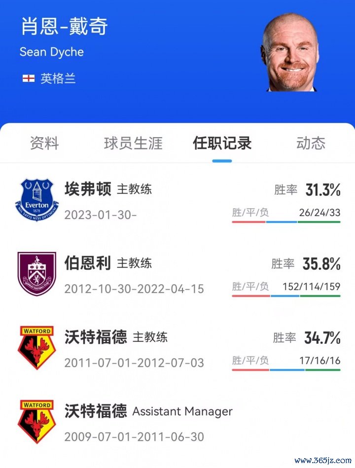 戴奇曾持教沃特福德、伯恩利、埃弗顿,本年1月从埃弗顿下课。