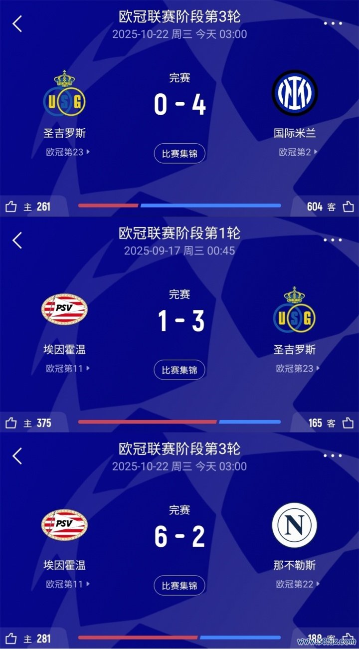 国米4:0圣吉罗斯3:1埃因霍温6:2那不勒斯