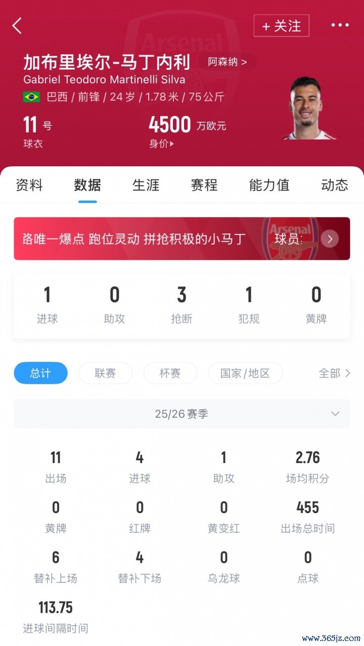 10月22日讯 本轮欧冠阿森纳主场4-0完胜马竞,先发登场的马丁内利精彩推射打入球队第二球,欧冠三轮照旧有三粒进球入账,本赛季筹谋打入4球仅次于队友约克雷斯。