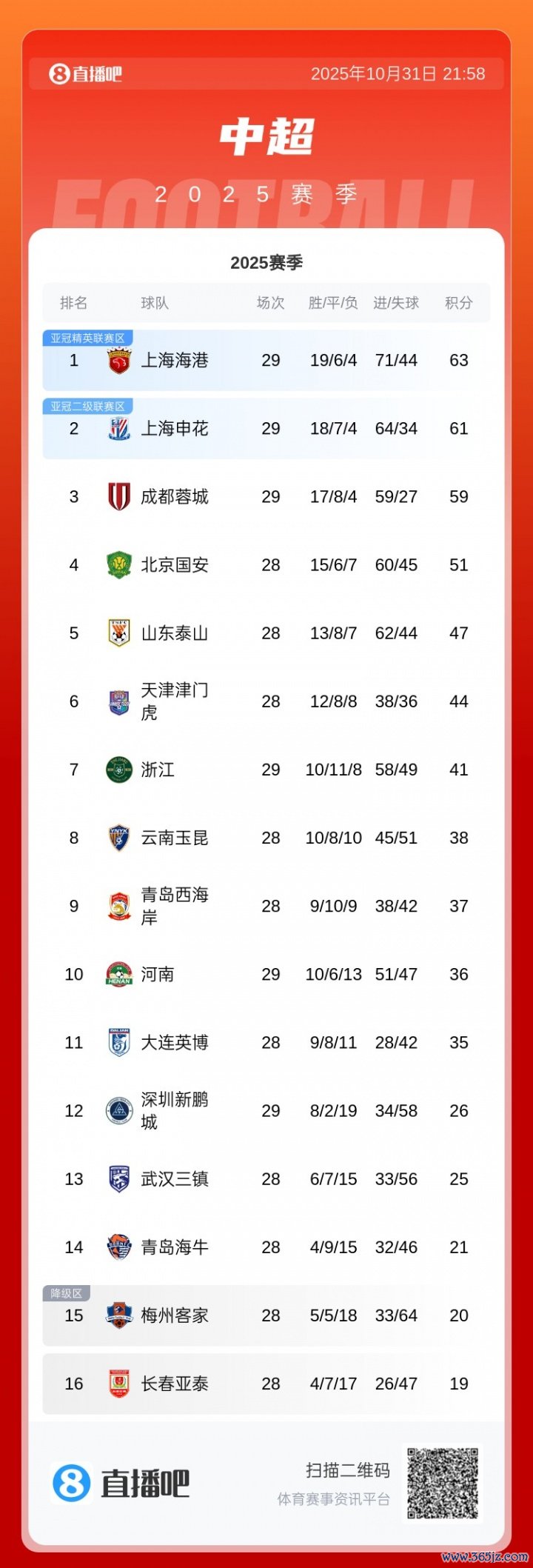 10月31日讯 中超第29轮,争冠三强中上海海港、上海申花取胜,成皆蓉城1-2负于河南。积分榜上蓉城59分提前1轮退出争冠,海港63分、申花61分连接紧咬。