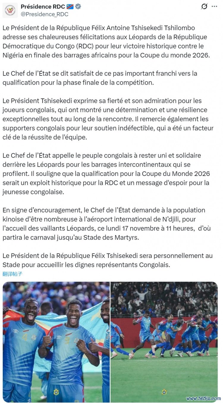 民主刚果总统府社媒祝福:“民主刚果共和国总统王人塞克迪向国度队暗示强烈祝福,该队在2026年世初赛非洲区附加赛决赛中历史性地礼服了尼日利亚队,王人塞克迪总统对迈向寰宇杯决赛圈的遑急一步暗示舒适,对民主刚果球员在整场比赛中展现出的超卓决心和韧性暗示无礼和钦佩,他还感谢球迷们执意不移的相沿,这是球队取得手利的遑急要素。