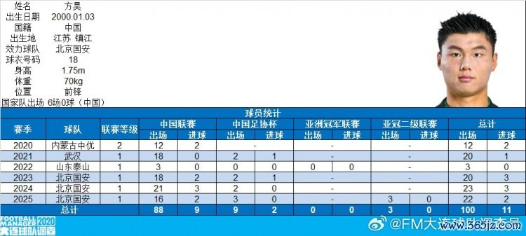 这100次出场中,方昊打算打入11球,其中代表内蒙古中优出战12场、打入2球,代表武汉队出战20场、打入1球,代表泰山出战3场,代表国安出战65场、打入8球。