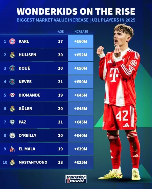《转会阛阓》统计了2025年U21球员的身价高涨幅度情况,拜仁小将卡尔位居榜首。德转列U21年度身价高涨榜:欧元