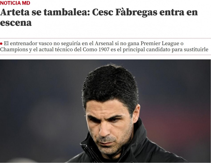 直播吧04月12日讯据西媒《世界体育报》最新消息,如果阿尔特塔本赛季无法率领阿森纳赢得英超或欧冠第一名 ,他将离任,而法布雷加斯已成为接替他的主要人选。