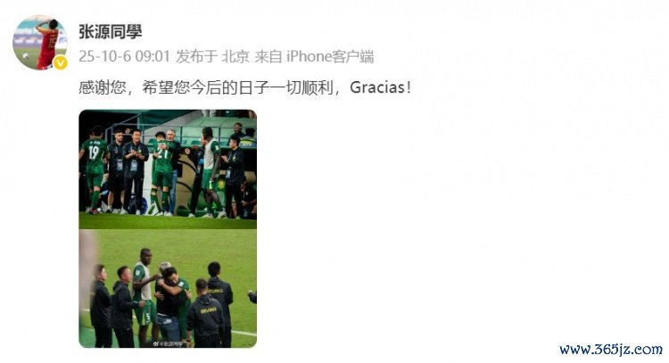 10月6日讯 昨晚,北京国安俱乐部官方秘书主帅塞蒂恩离任。国安球员张源更新个东说念主微博,向塞蒂恩奉上祝颂。