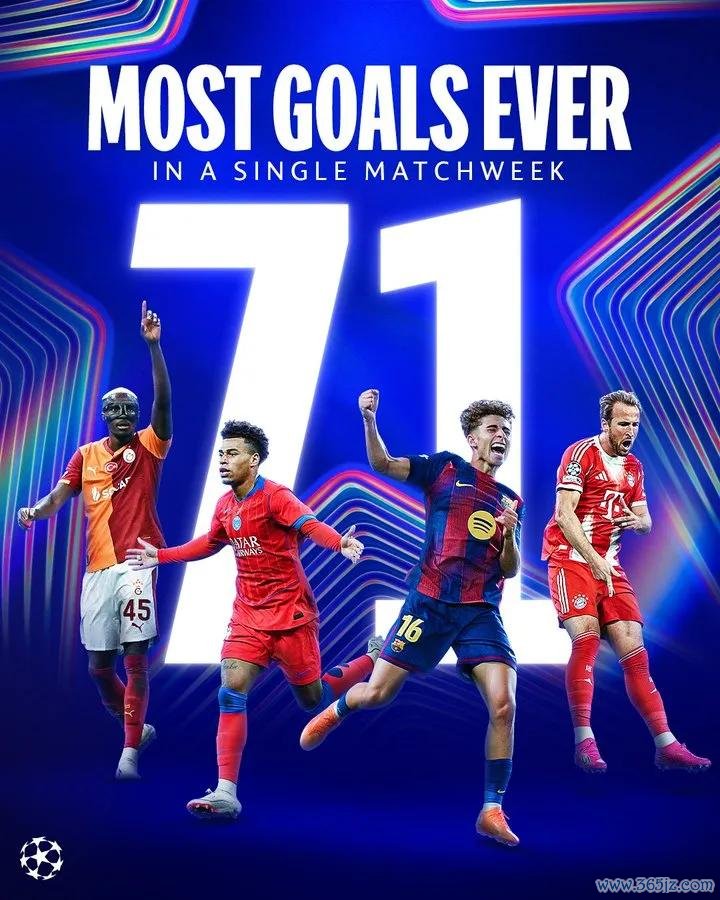 这个创记载的单轮进球数统计自欧冠19992/93赛季改制为欧冠联赛小组赛后,不包括1999/2000至2002/03赛季第二阶段小组赛。此前的记载是2024/25赛季第5轮和2025/26赛季第1轮(67球,18场比赛),2024/25赛季第5轮多达9场比赛至少进5球,2025/26赛季第1轮惟有5场比赛进球数至少5球。本赛季第1轮尤文图斯4比4多特蒙德单场打出8个进球,但被本赛季第3轮勒沃库森2比7大巴黎罕见。