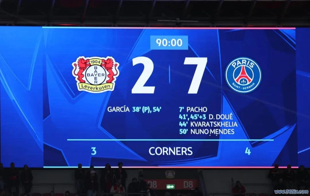 7比2客场横扫勒沃库森的大巴黎,毫无疑问是第3轮欧冠进球创记载的旗头。这个7比2的大捷追平了大巴黎欧冠联赛队史的单场最大比分胜绩,此前是2000/01赛季小组赛第5轮主场7比2大捷挪威的罗森堡,以及2022/23赛季小组赛第5轮主场7比2海法马卡比,但相通比分的比赛含金量,彰着不如此次客场横扫德甲权门勒沃库森。