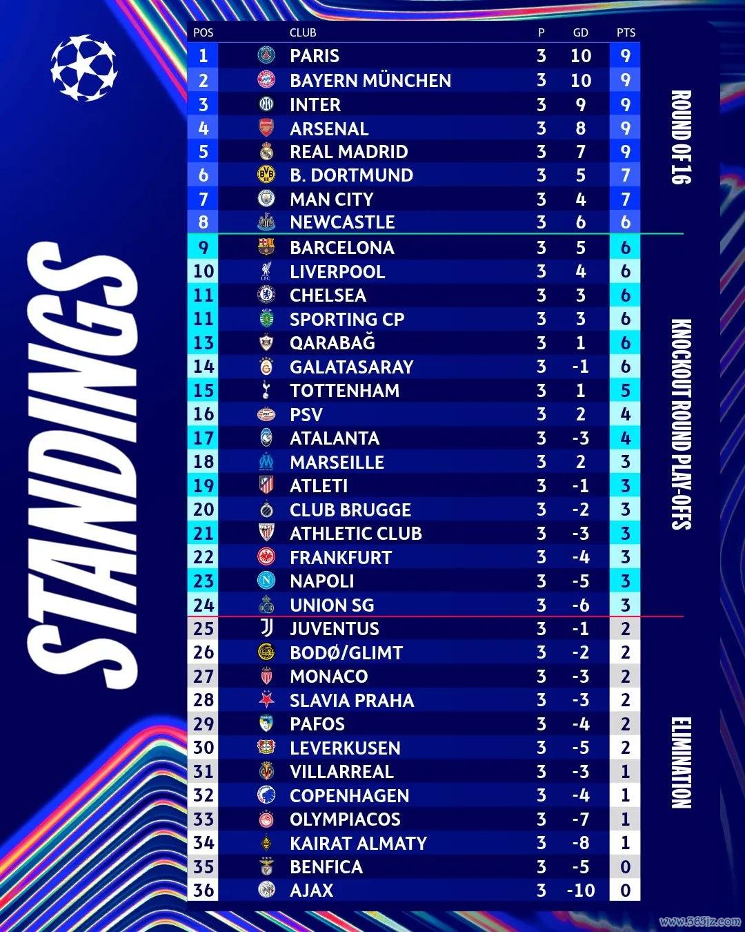 本赛季欧冠联赛阶段第3轮18场比赛67个进球,场均进球数达3.72球。与之相对应的是,积分榜上3战全胜的5支球队——大巴黎、拜仁、海外米兰、阿森纳和皇马均是五大联赛权门,致使名次前11位的球队齐来自五大联赛,五大联赛的把持过于杰出。欧足联官网发布了这个单轮破记载的音讯时,也建议了问题:咱们是否正在见证,频年最得意东说念主心的欧冠联赛?