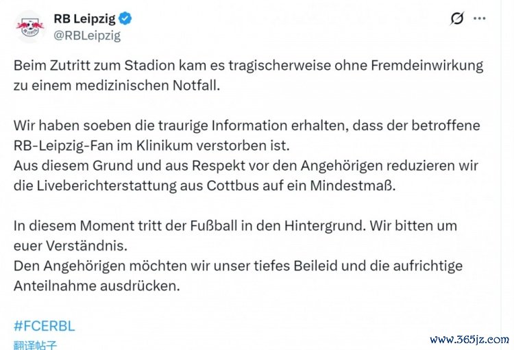 莱比锡俱乐部阐述,又名莱比锡球迷插足球场时发生伏击医疗情况(与外部成分无关),被送往病院,最终在病院物化,莱比锡俱乐部社媒因此将这场比赛的直播报谈减少到最低罢休,并向家属示意真切慰问。