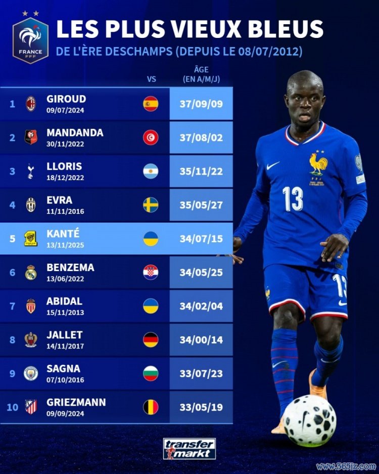11月15日讯 世初赛欧洲区比赛,坎特踢满全场,匡助法国主场4-0打败乌克兰,德转列出了德尚持教法国队以来年纪最大出场球员名次,吉鲁居首,坎特排在第5位。