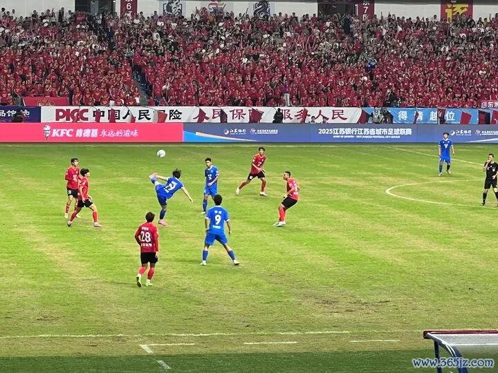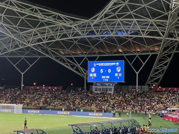 10月7日晚,2025年江苏省城市足球联赛淘汰赛阶段一场焦点战在“南鸟巢”南通体育会展中心畅通场打响。主场作战的南通队以5比0打败淮安队,顺利晋级四强。