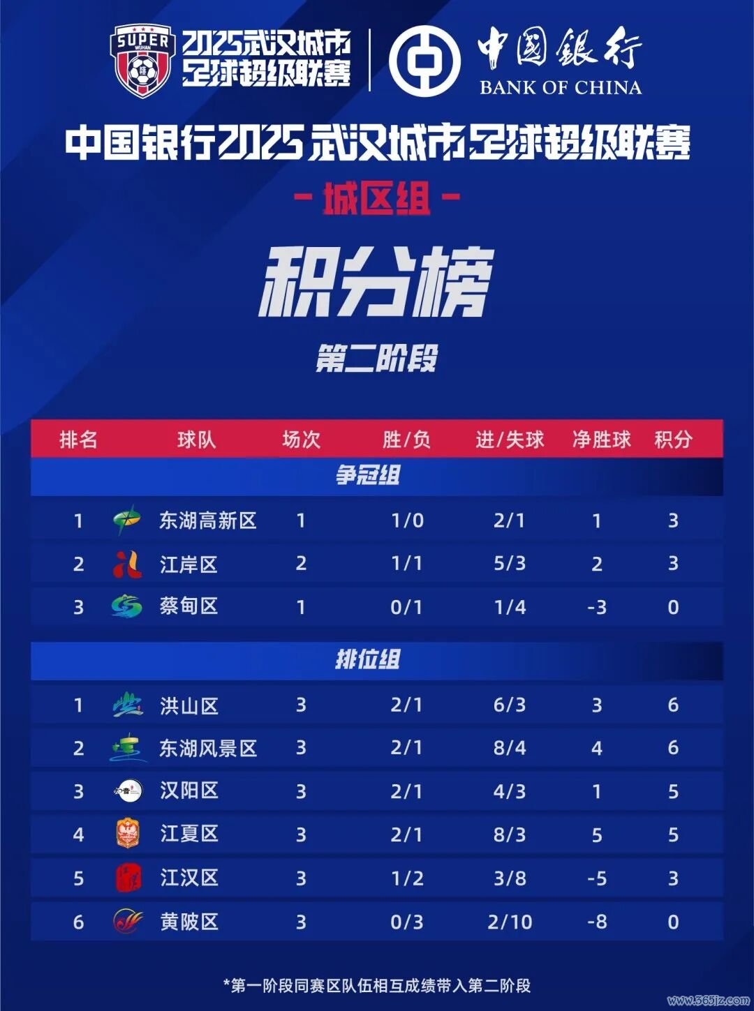 【越乔】从 武汉城市足球超等联赛获悉, 城区组 第二阶段 积分榜出炉,东湖高新区、江岸区、蔡甸区为争冠组。 赛前曾有网友留言,“打赢了即是市中心”。
