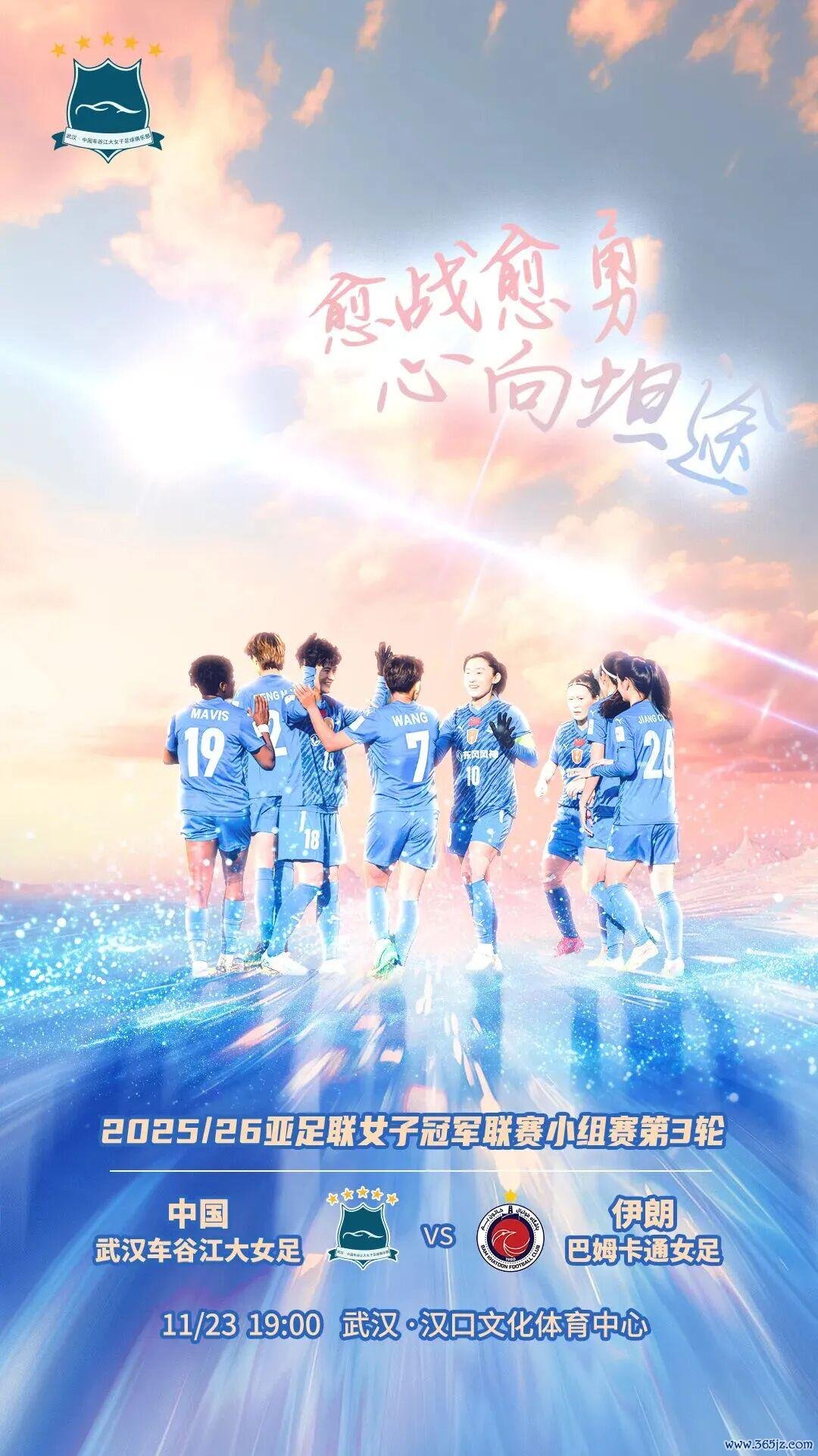 11月23日19:00,2025/26赛季亚足联女子冠军联赛小组赛B组第三轮,武汉车谷江大女足将镇守汉口文化体育中心迎战伊朗球队巴姆卡通女足。